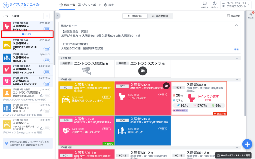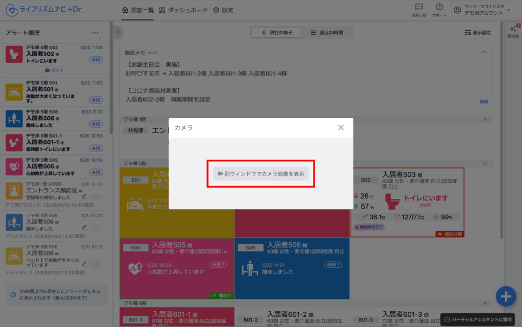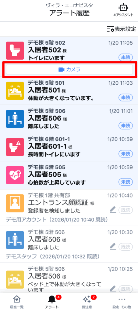 カメラを導入されている施設では、アラート履歴のカメラボタンからアラートが発報した居室のライブビューを閲覧することができます。