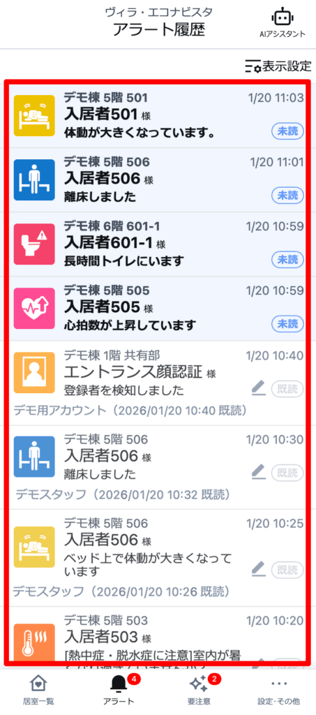 居室内で変化があった場合や、注意を促す場合に発報される「アラート」の内容をアイコンの種類とコメントで表示します。 設置されるセンサーの種類によっては、お知らせ…