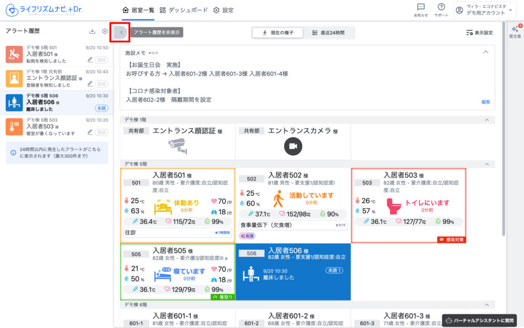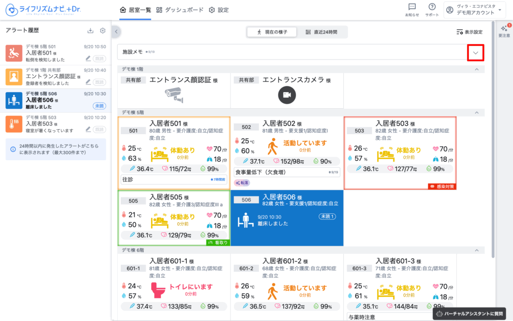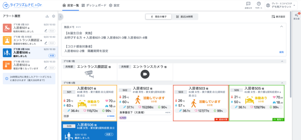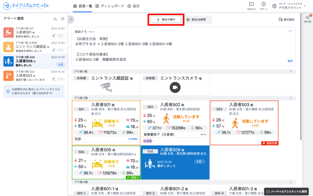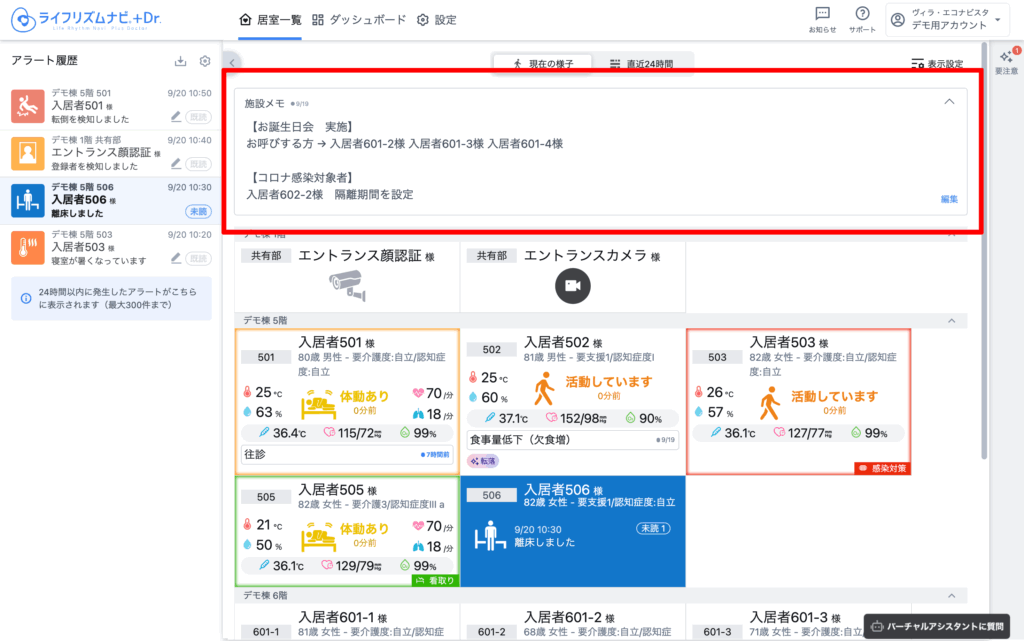 見守り対象者の情報は、入居者名、1行メモ、ハイライトが表示されます。