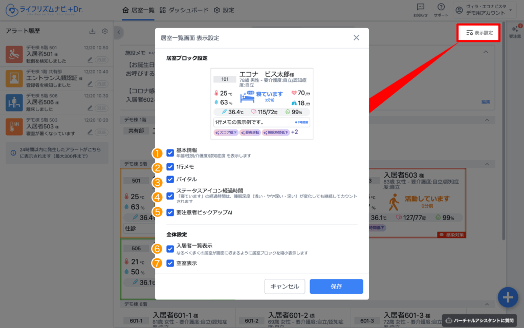 ❶~❺は、居室ページにはチェックのON/OFFに関わらず表示されます。