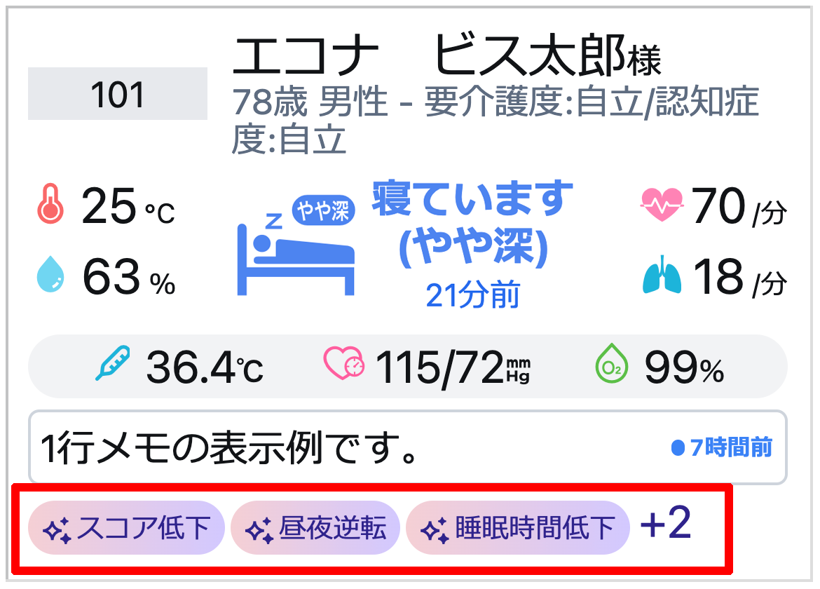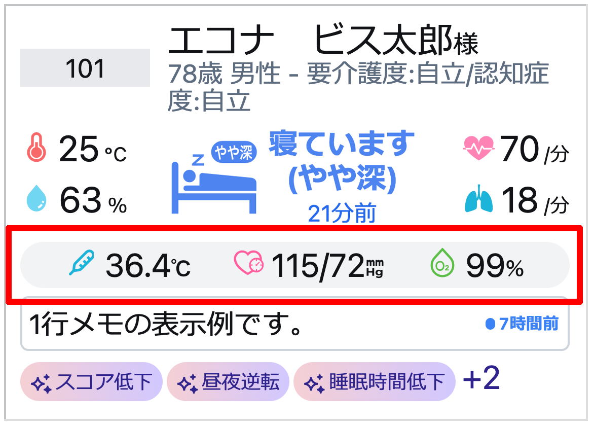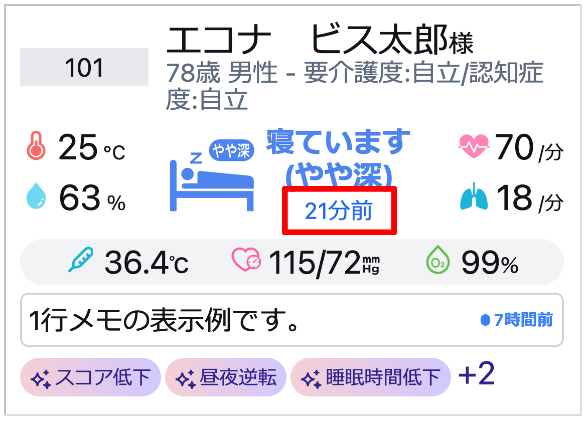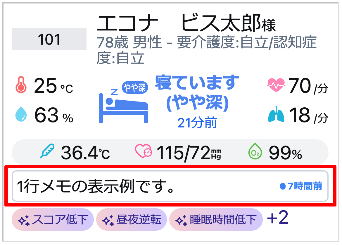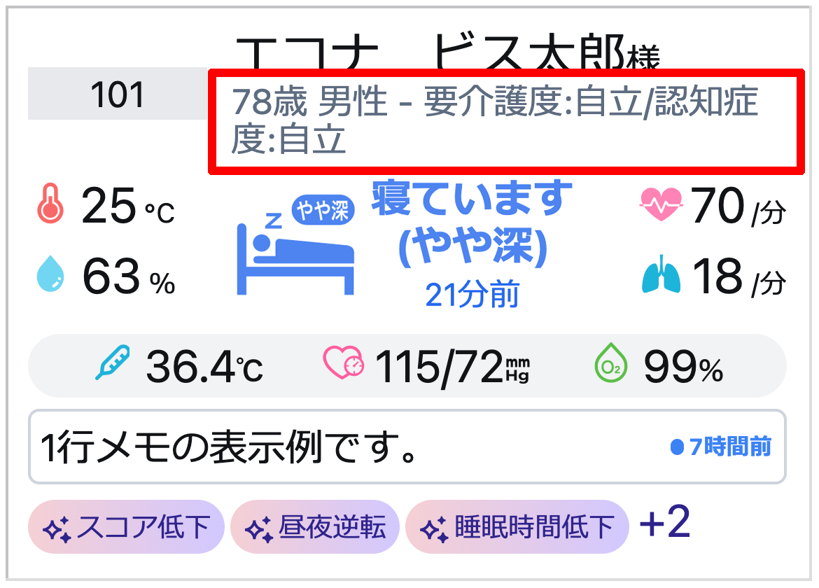 見守り対象者の情報は、入居者名、1行メモ、ハイライトが表示されます。