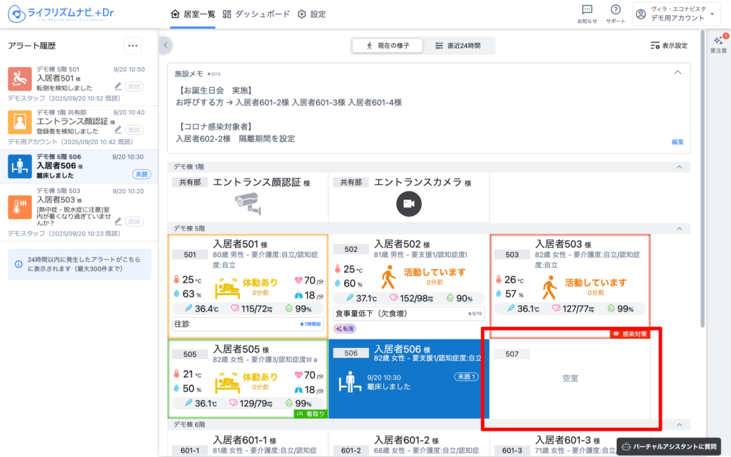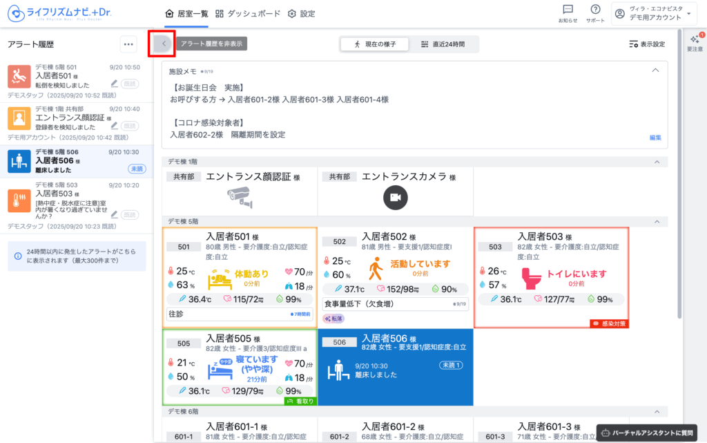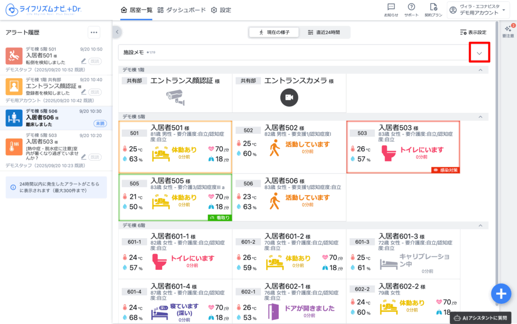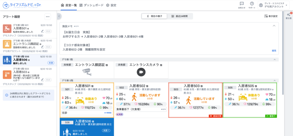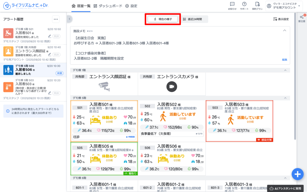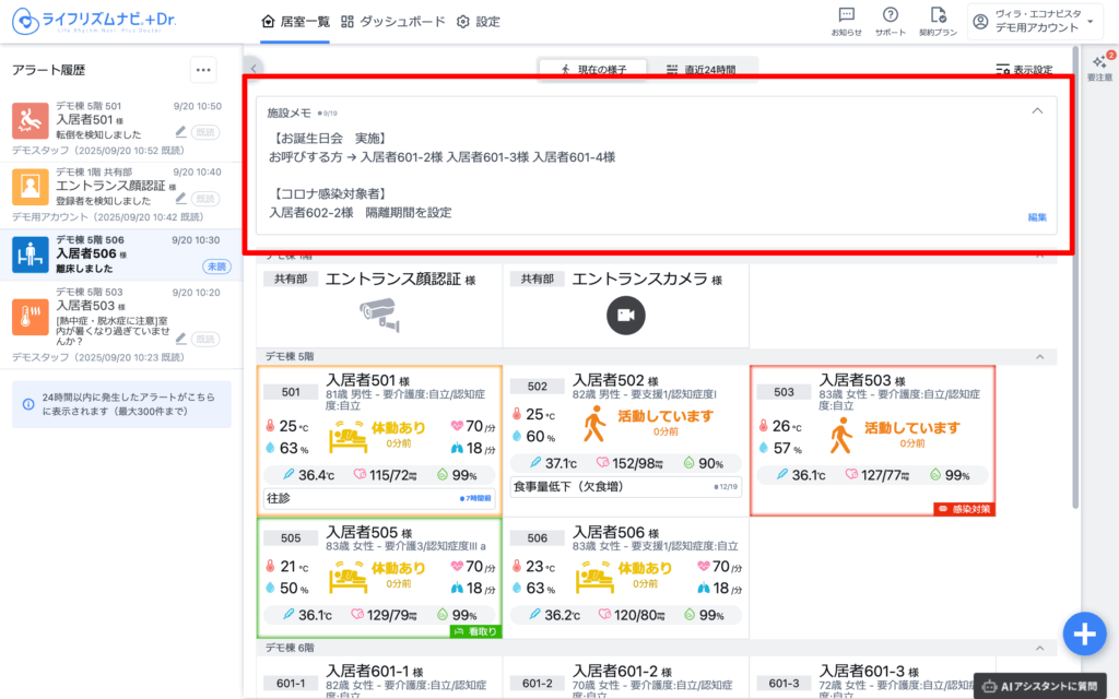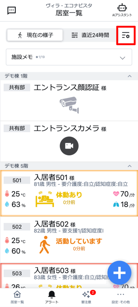 見守り対象者の情報は、入居者名、1行メモ、ハイライトが表示されます。