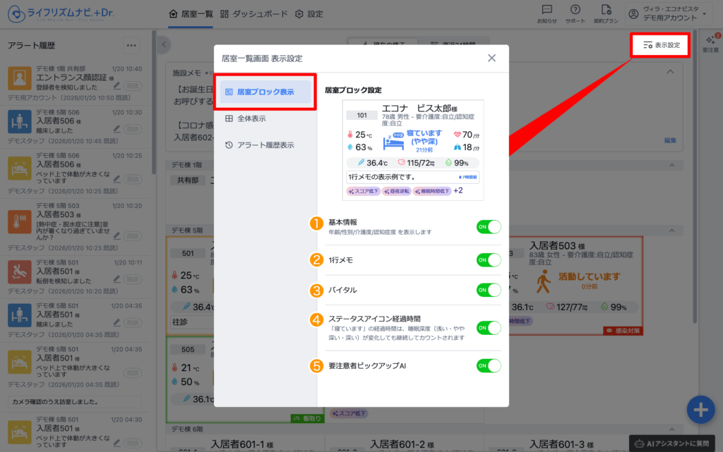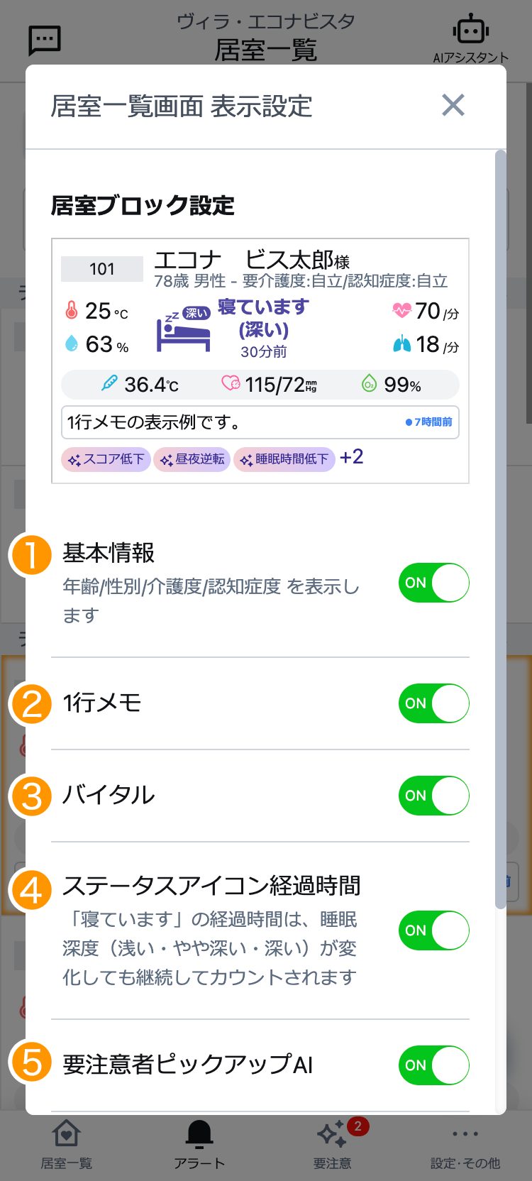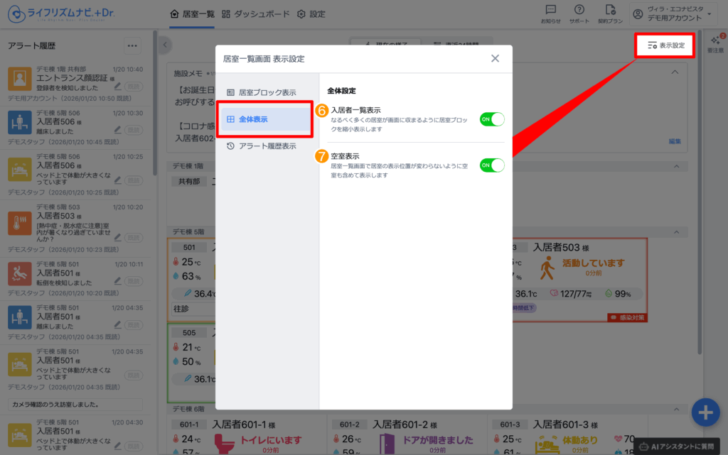 ❶~❺は、居室詳細ページには設定のON/OFFに関わらず表示されます。