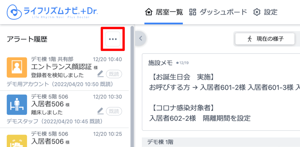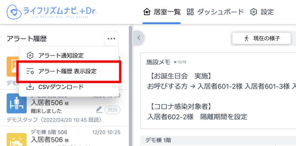 居室一覧画面のアラート履歴エリアのメニューアイコンからも、同じ設定画面を開くことができます。