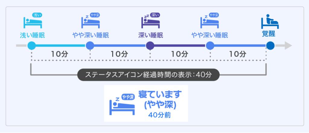 ❹ 「寝ています」の経過時間は、睡眠深度(浅い・やや深い・深い)が変化しても継続してカウントされます。