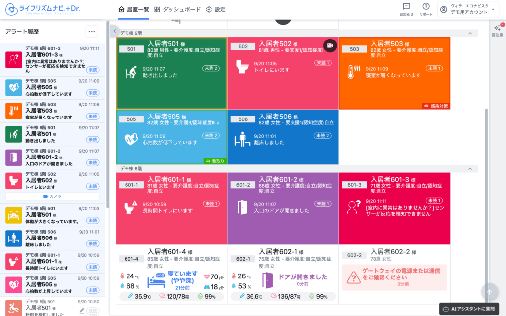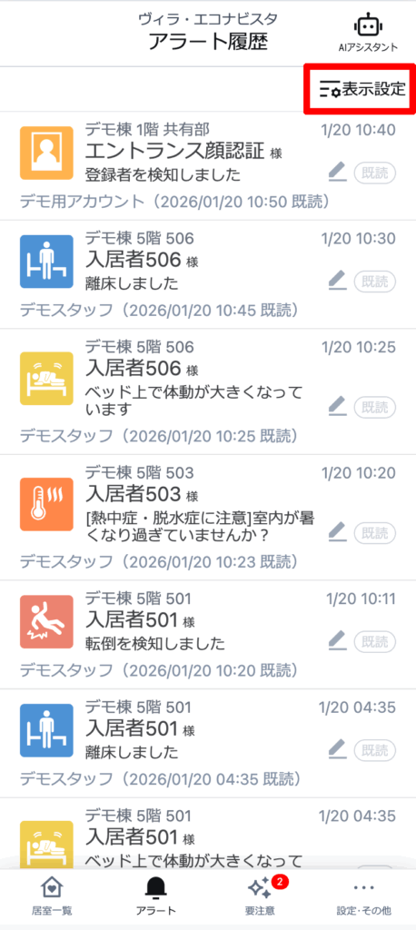 アラートをクリックすると、その居室のアラートはすべて確認済(既読)に変更されます。