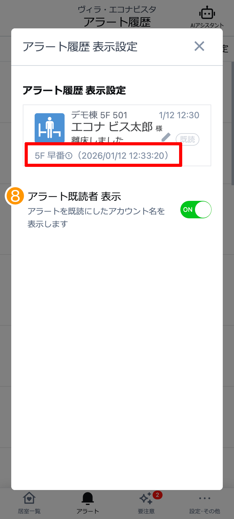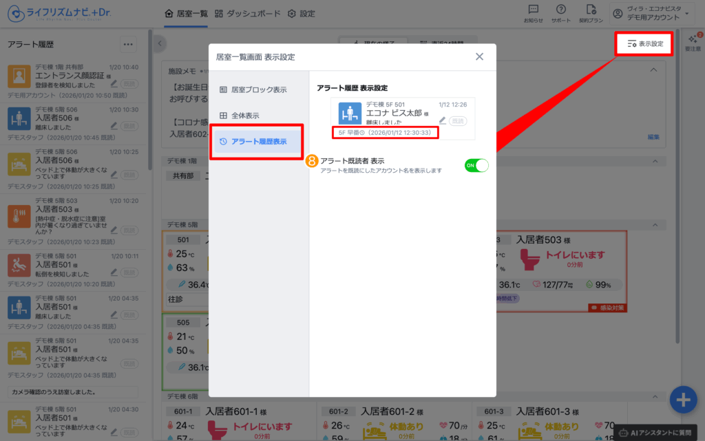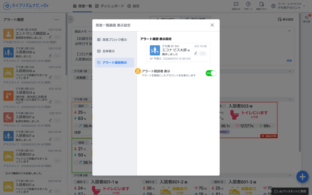 アラート既読者 表示をONにすると、居室一覧画面左側のアラート履歴に、アラートを既読にしたアカウント名が表示されます。