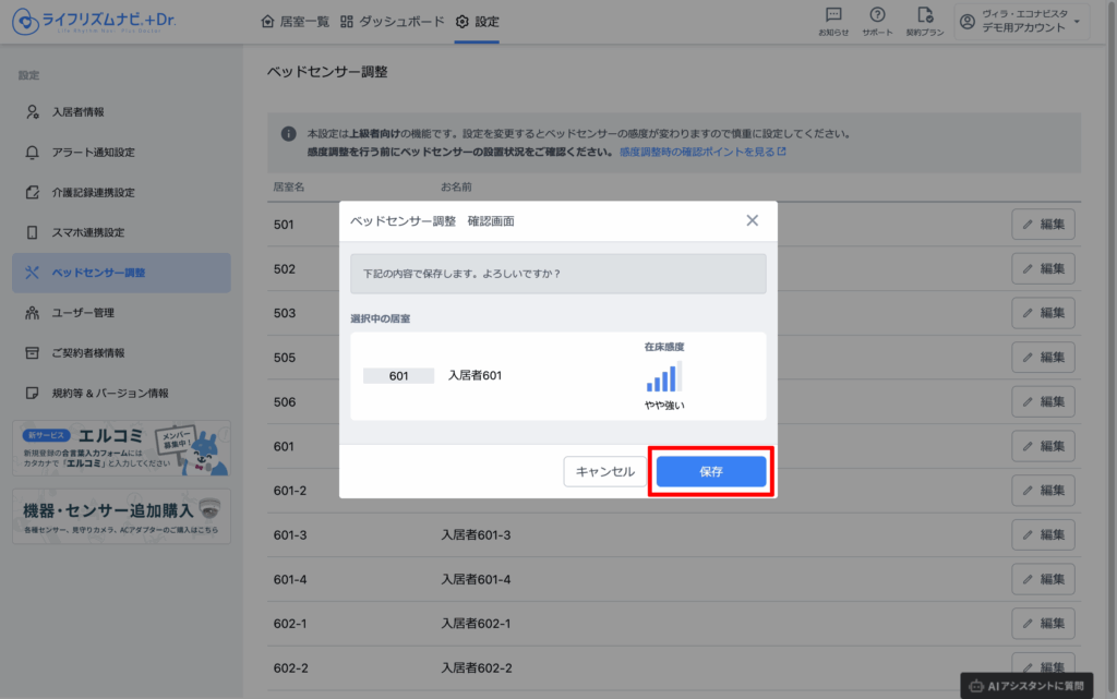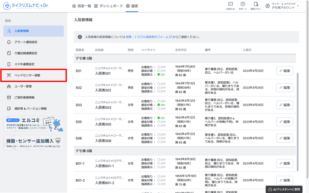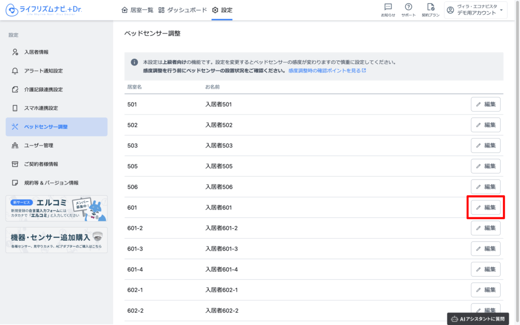 ベッドセンサーの感度を変更したい居室の [編集] をクリックします。