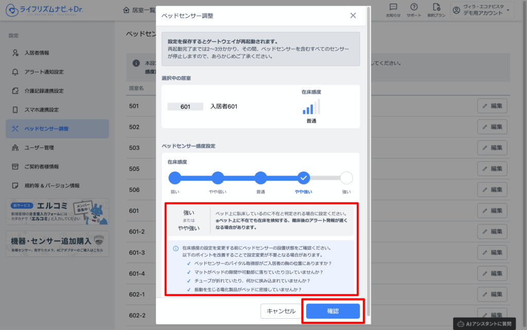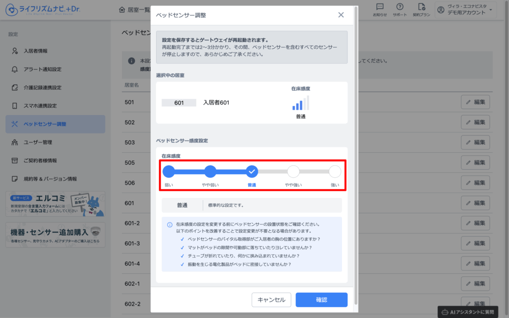 本設定は上級者向けの機能です。設定を変更するとベッドセンサーの感度が変わりますので慎重に設定してください。