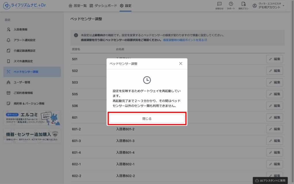 このページでは、ユーザー様においてベッドセンサーの感度を調整する手順について説明します。