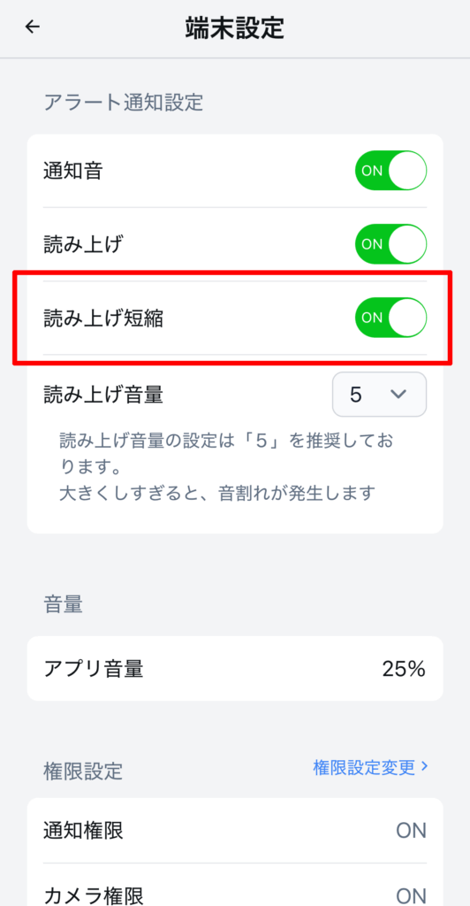 アプリの「読み上げ短縮」設定をONにすることで、アラートの読み上げ内容を短くできます。