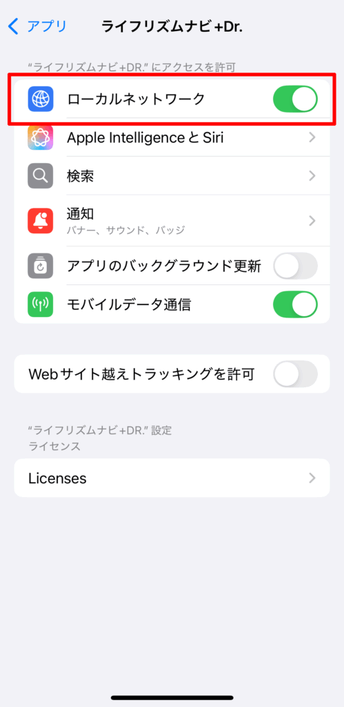 - ライフリズムナビ+Dr.に「ローカルネットワーク」の項目が表示されていない