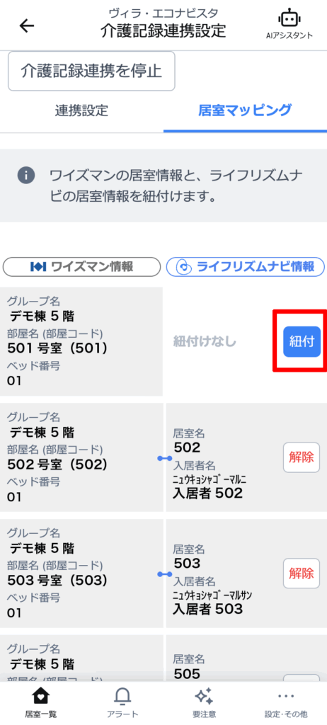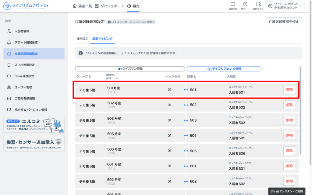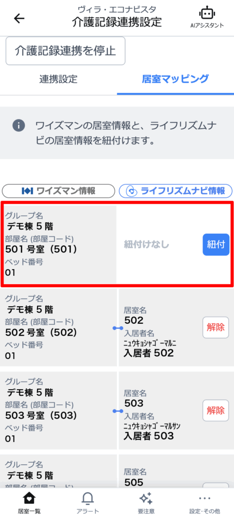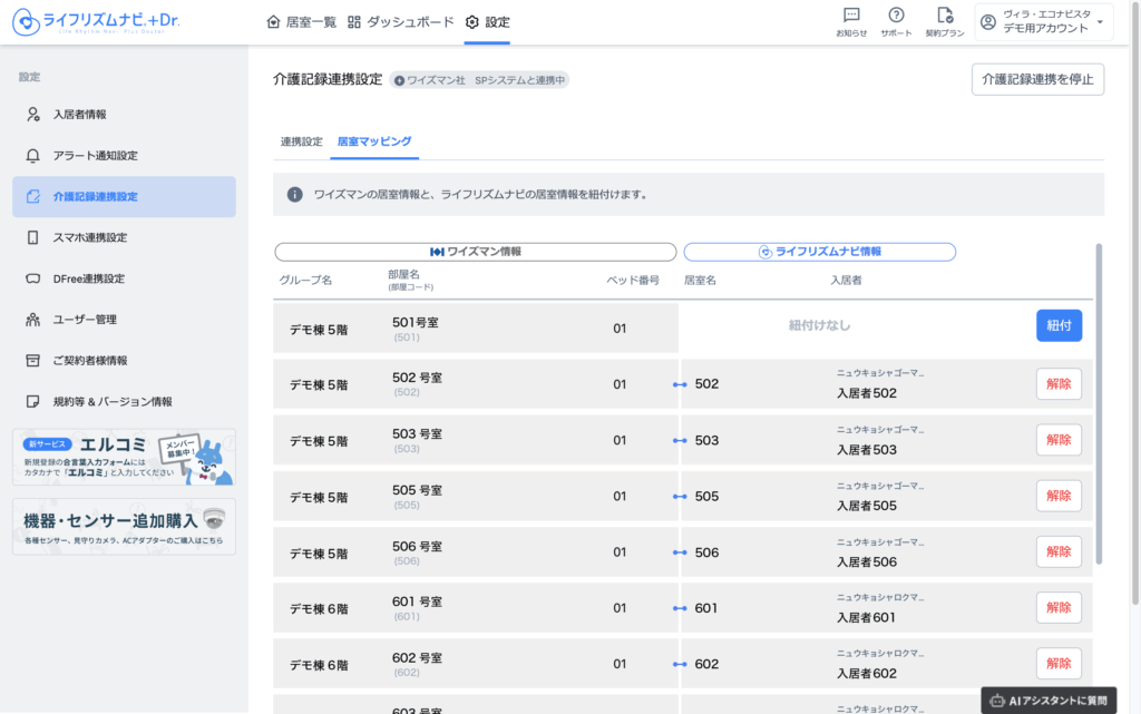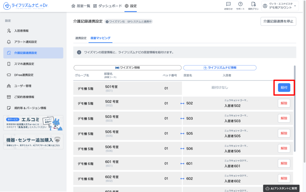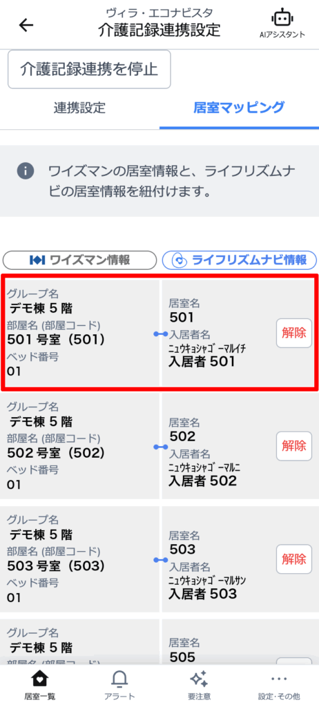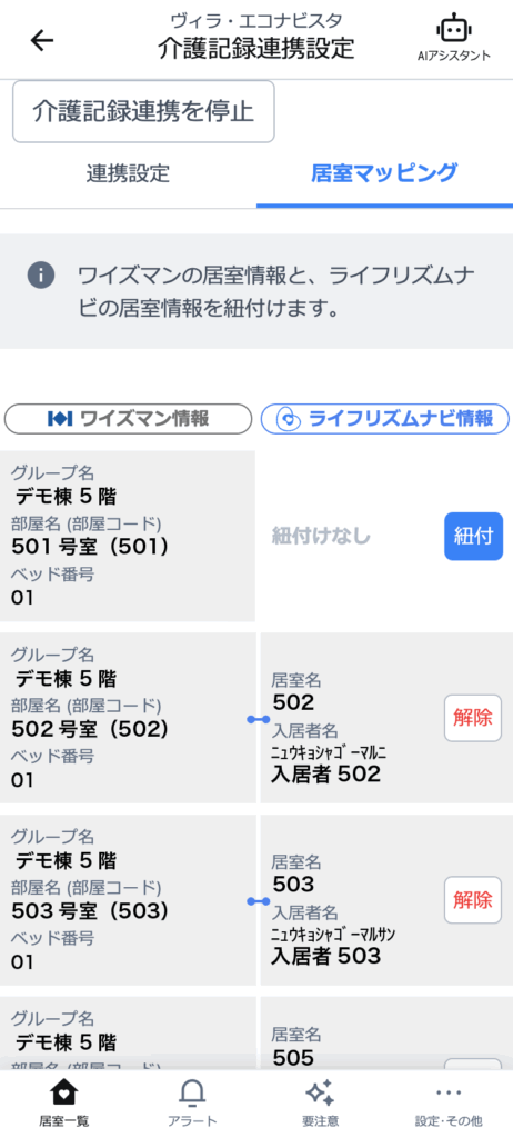 ワイズマンとライフリズムナビの両方に居室情報が表示されていれば、紐付け作業は完了です。