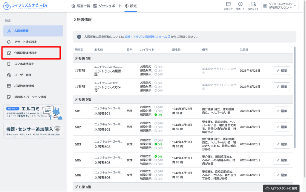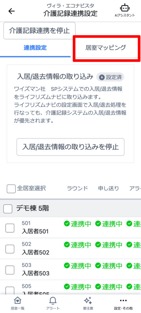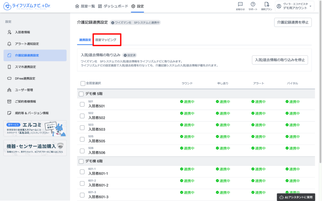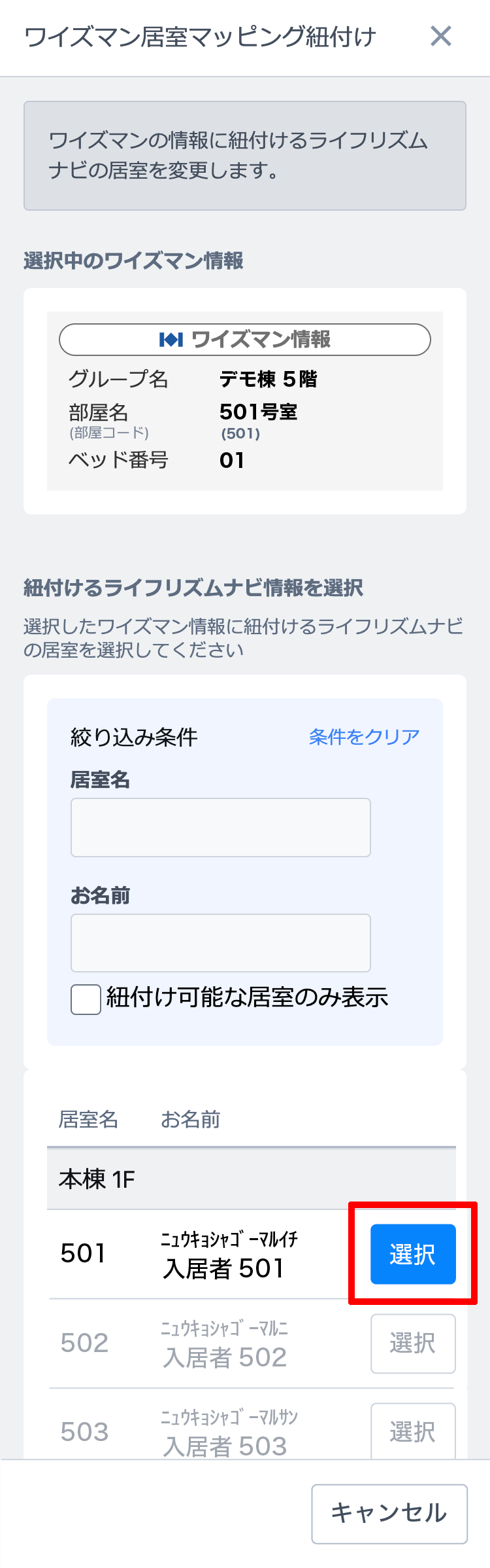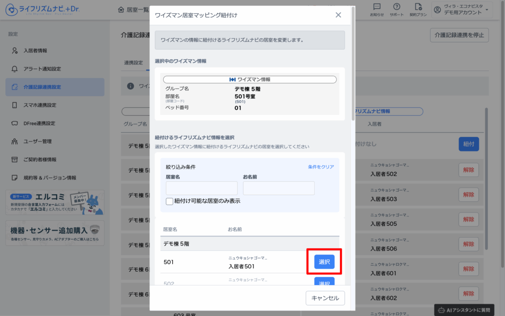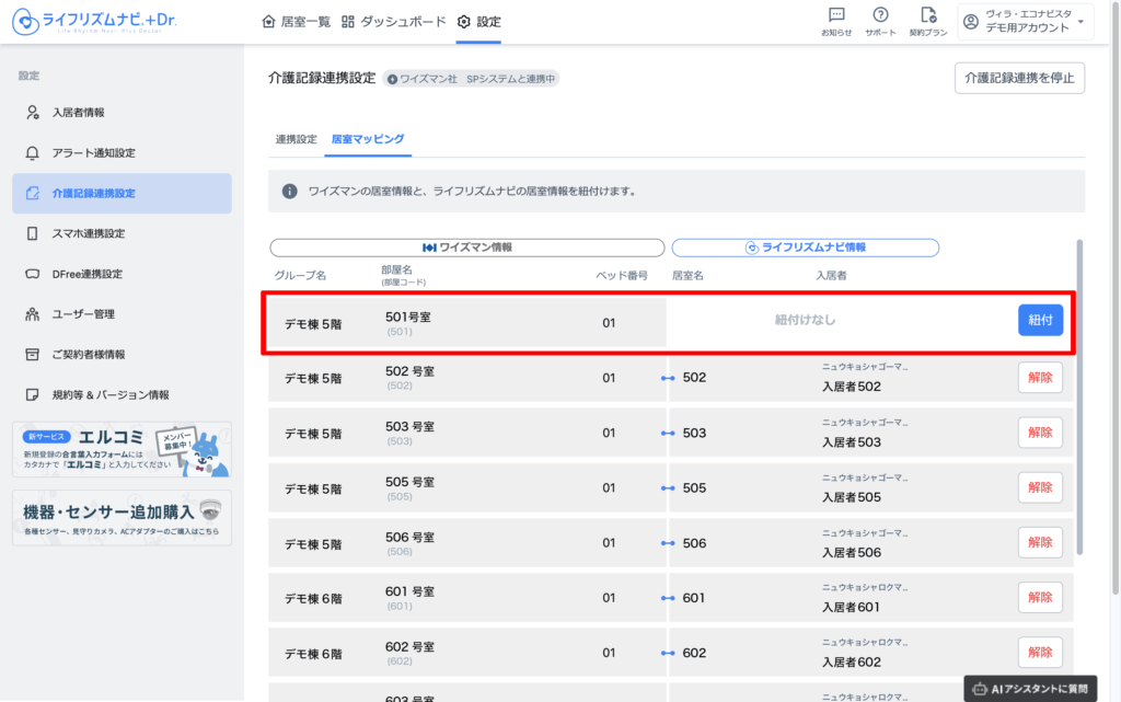 ワイズマンとライフリズムナビの両方に居室情報が表示されていれば、紐付け作業は完了です。