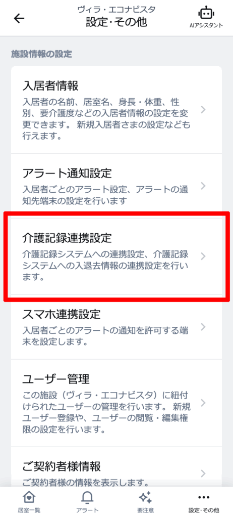 設定ページを開き、 「介護記録連携設定」をクリックします。
