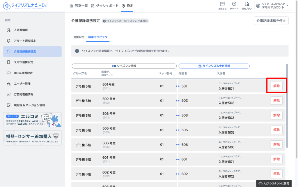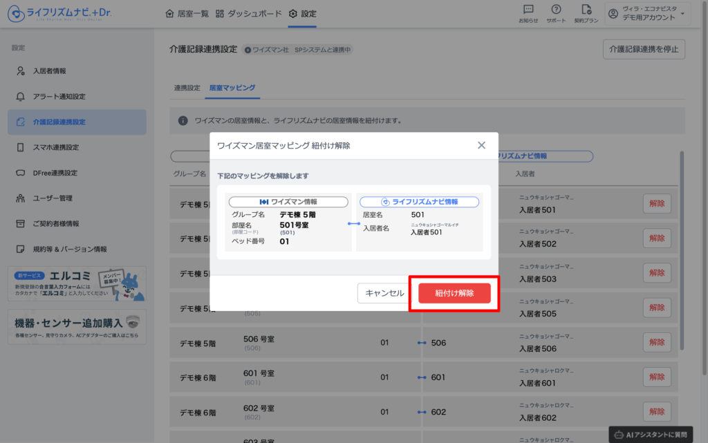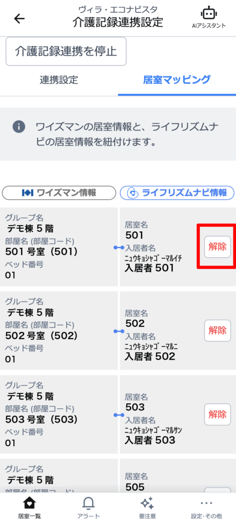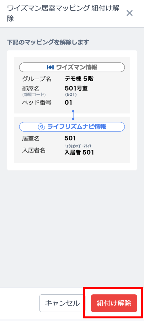 ワイズマンとライフリズムナビの居室情報の紐付けを解除する