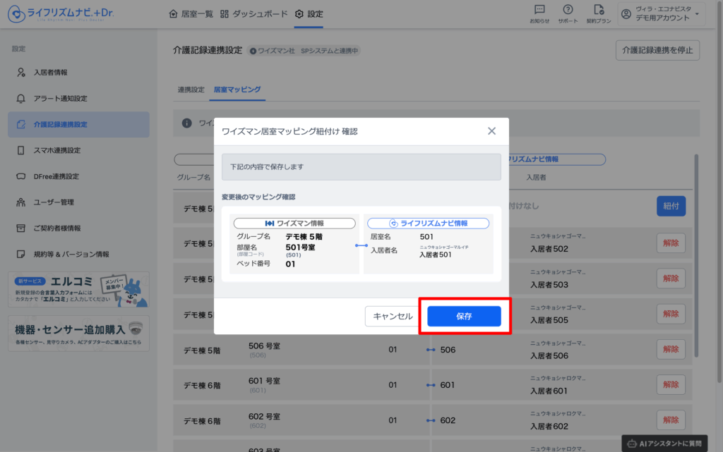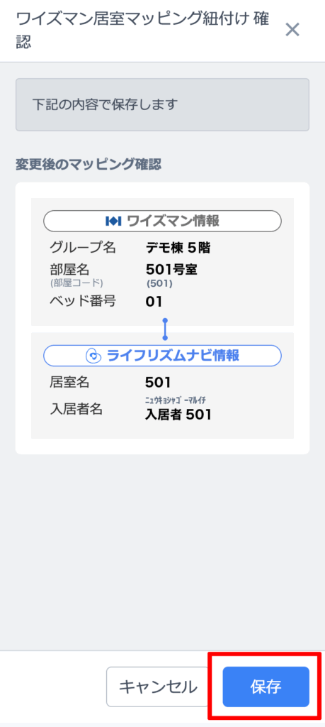 紐付けされる居室情報を確認し、保存 をクリックします。