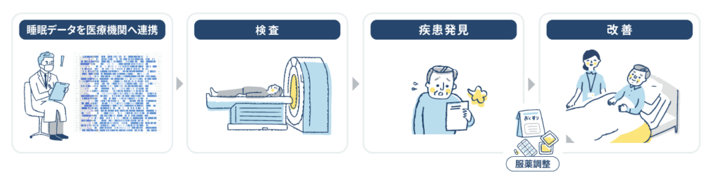 このタイガーロールでは、睡眠データを医療機関に提供したことで検査に繋がり、疾患が発見され、その後の服薬調整などにより改善が見られた事例をご紹介いたします。