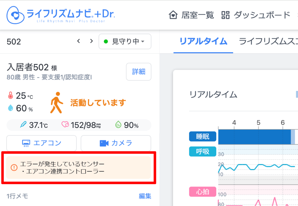 今回のアップデートで、エアコン連携コントローラーが通信エラーの際は、居室詳細画面に以下のエラーが表示されるようになりました。